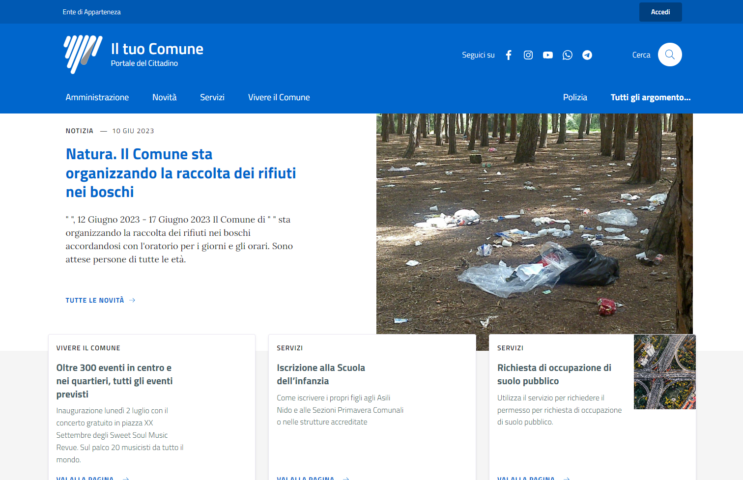L'Home Page del sito è la prima pagina che viene visualizzata da parte del cittadino all'accesso al portale istituzionale. All'interno della pagina vengono mostrate le informazioni di maggiore rilevanza per i cittadini, suddivise in sezioni orizzontali in base alla tipologia di informazione trattata