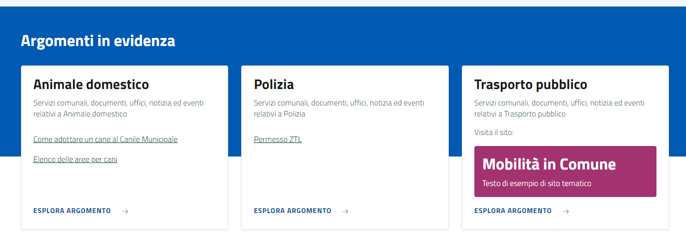 Sezione della Home page che mostra gli argomenti di maggiore evidenza del Comune, fino ad un massimo di 3 argomenti. Qualora un argomento sia correlato ad un sito tematico viene reso visibile un bottone, che permette di accedere al sito tematico relativo all'argomento. Selezionando il pulsante "Esplora un argomento" è possibile entrare nel dettaglio dell'argomento selezionato