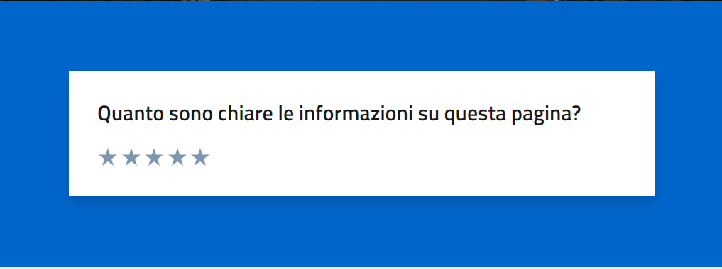 Sezione dedicata alla valutazione da parte dei cittadini delle informazioni contenute all'interno del contenuto selezionato. A seguito dell'inserimento della valutazione, che parte da 1 stella come voto minimo fino ad un massimo di 5 stelle, viene posta una domanda a scelta multipla al recensore, in modo tale da fornire un feedback al Comune per la gestione del contenuto.