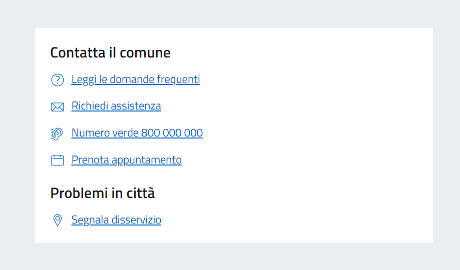 Le informazioni selezionabili sono automaticamente mappate sulla base di quanto censito sul sito web e non sono modificabili. Lo scopo della funzionalità è offrire un canale diretto agli utenti per chiarimenti specifici sul servizio: non si tratta di un canale di assistenza tecnica. Le richieste saranno trasmesse, salvo specifiche configurazioni particolari, al canale di contatto abbinato all'ufficio.