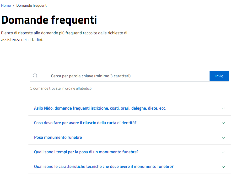 La voce offre l'accesso ad una specifica sezione del sito dalla quale il cittadino può consultare una lista di domande con le relative risposte. Il popolamento di questi contenuti avviene direttamente dal CMS secondo una specifica funzionalità disponibile per gli operatori preposti. Per maggiori informazioni consulta la sezione Guida all'utilizzo del sito.