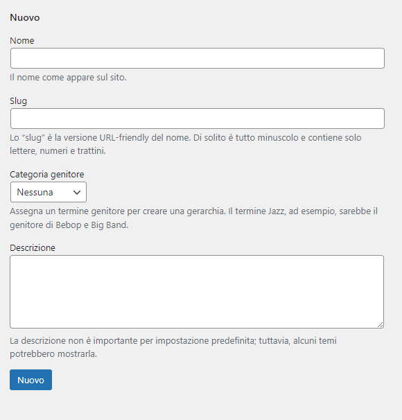Quindi scegli un nome da assegnare alla categoria e al termine, clicca su "nuovo".