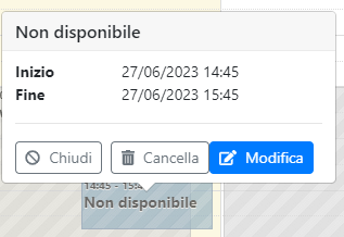 Per modificare o eliminare un periodo di indisponibilità cliccare sul blocco presente a calendario e quindi rispettivamente sul bottone "modifica" o "elimina":