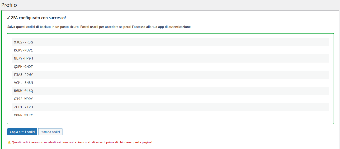 ATTENZIONE: Dopo aver salvato, verranno generati dei codici di backup. Salvali in un posto sicuro!