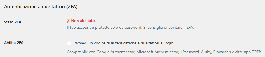 Dalla pagina del profilo, scorrendo verso il basso, troverai la sezione "Autenticazione a due fattori (2FA)":