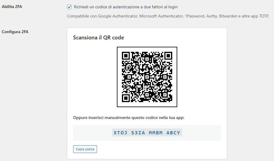 A questo punto comparirà il QR code da inquadrare con la tua app di autenticazione preferita (es. Google Authenticator, Microsoft Authenticator, Authy, 1Password, ecc.):